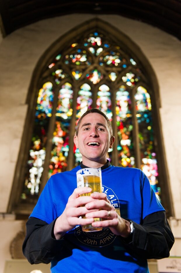 Rev Matt Woodcock with a pint in front of a large stained glass window