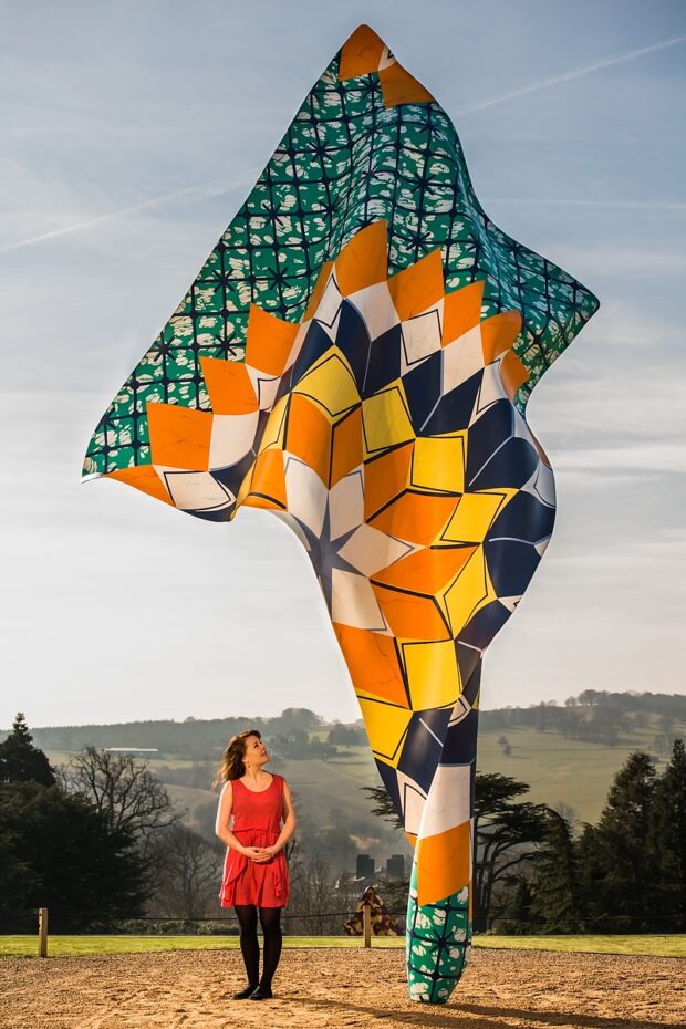 Beautifully sunny weather at Yorkshire Sculpture Park. PICTURED is Helen Thackray with Yinka Shonibare’s artwork. STORY ABOUT the park featuring the most extensive exhibition by British-Nigerian artist Yinka Shonibare MBE. The exhibition, FABRIC-ATION, features over 30 works by the artist and two major outdoor commissions. The outdoor Wind Sculptures feature Shonibare’s signature batic fabric pattern and appear like giant handkerchiefs caught in the wind. (CREDIT Jonathan Pow | 07901 617571 | jp@jonathanpow.com)