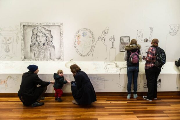 Little Eric Roman (18 months) looks to the camera with parents Jennie (right) and Peter (right). York Art Gallery has today opened it’s doors and walls for visitors to graffiti. The event is the last day before the gallery closes for a two year renovation project. (CREDIT Jonathan Pow | 07901 617571 | jp@jonathanpow.com)
