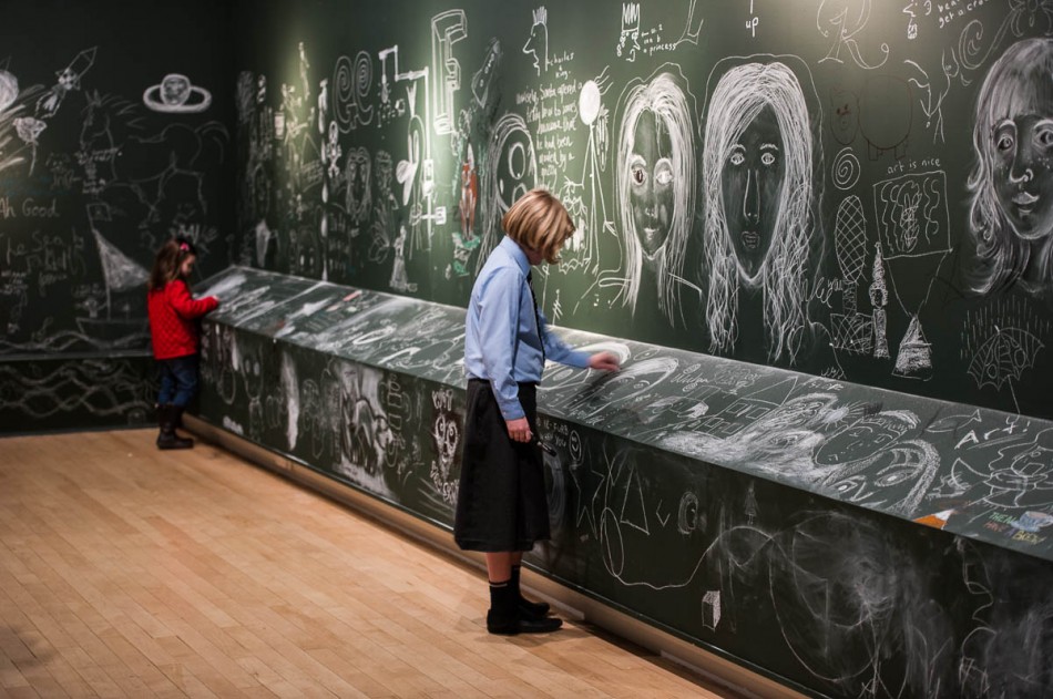 Two girls draw on the walls in the gallery. York Art Gallery has today opened it’s doors and walls for visitors to graffiti. The event is the last day before the gallery closes for a two year renovation project. (CREDIT Jonathan Pow | 07901 617571 | jp@jonathanpow.com)